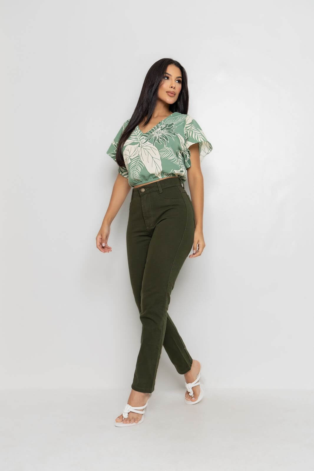 Possui cintura alta e ajustada, e vai afunilando a perna até o tornozelo.